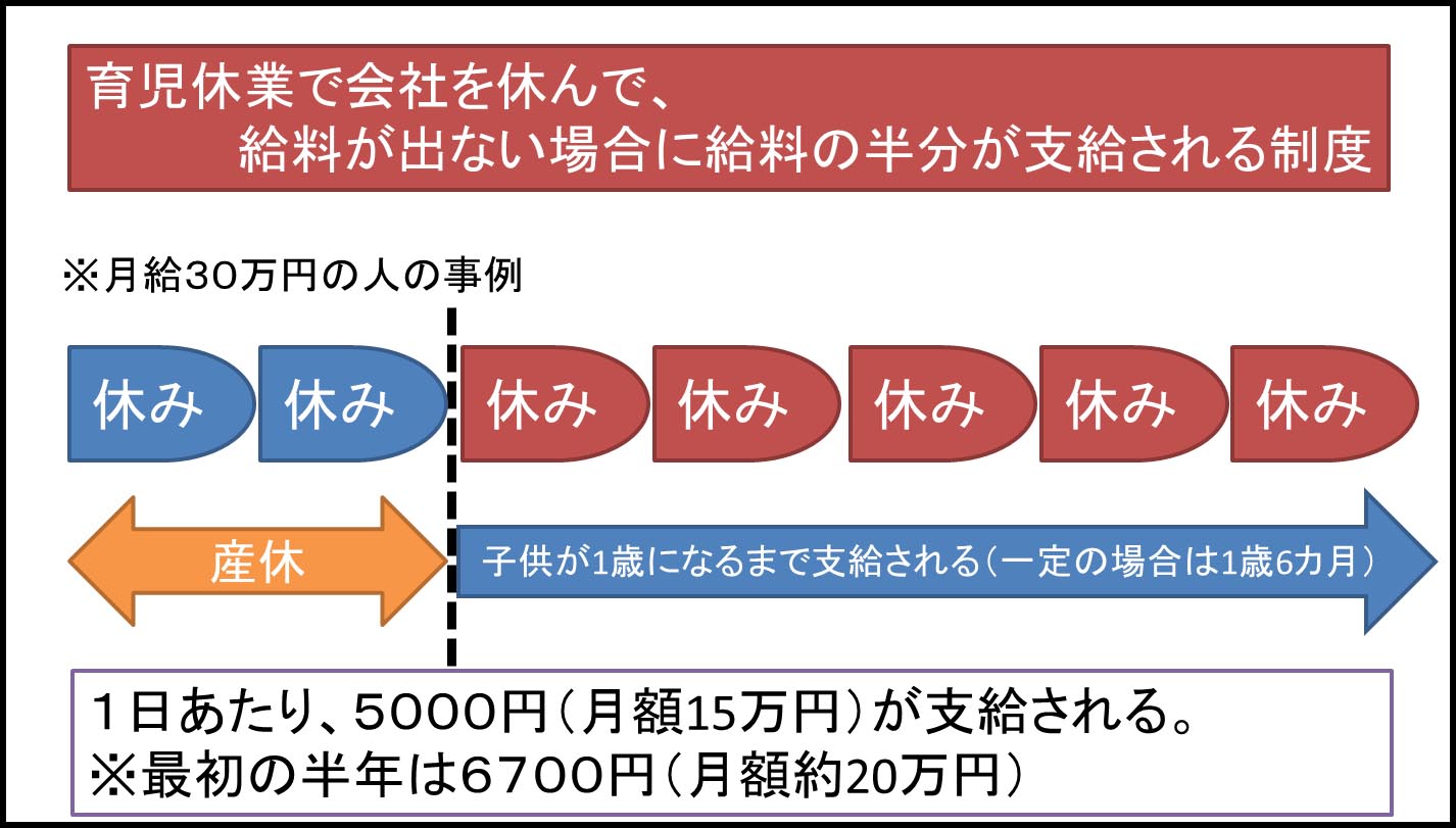 育児休業中に最初の半年間は給料の67%、その後は50%が支給される制度です。